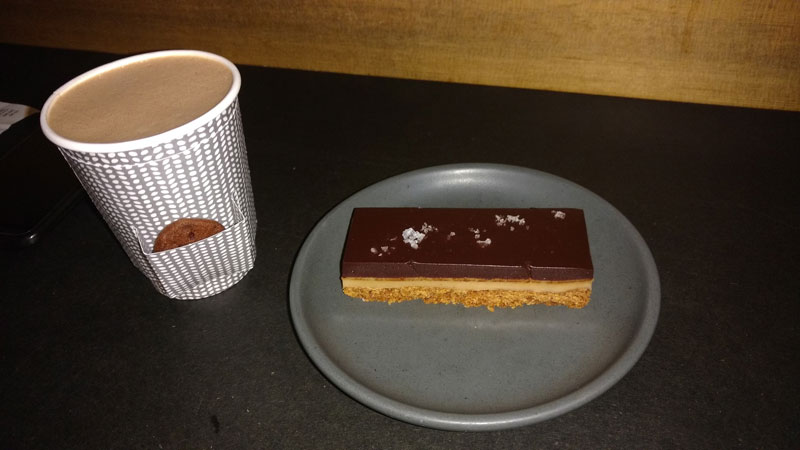 Americano (US$3) e um Dulce de Leche Bar (US$4). Se enganaram no nosso café e nos deram um chocolate quente! hahaaha