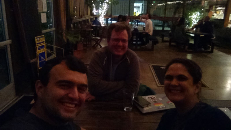 - Fomos de Uber para Oakland (US$5.75) participar de um Meetup sobre JavaScript às 17:30: mas apareceu apenas mais um