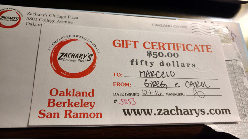 - Fomos de Uber (US$5.75) jantar na Zachary's Pizzaria em Oakland: super presente dos amigos Greg e Carol :)