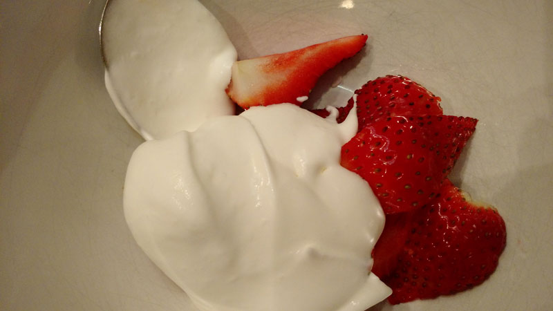 - A janta foi em casa pizza do dia anterior e morangos com "whipped cream" (chantilly) que eu fiz :) Ficou tri bom!!!