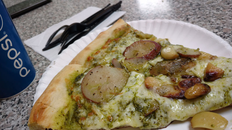 - Depois fomos buscar uma pizza de janta no Fat Slice (US$9 duas fatias), de Uber também (US$5.40). Queríamos o sabor do dia que havíamos visto no Facebook (com bacon),