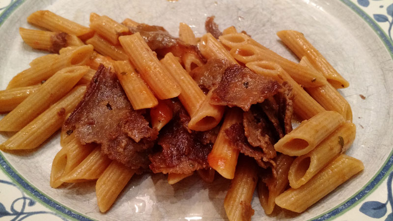 - Fizemos massa com molho e carne em casa