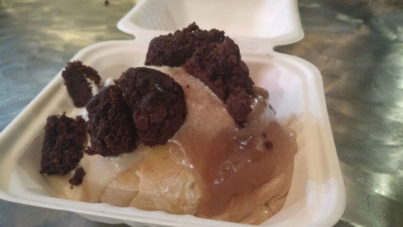 canela). Fomos à pé, basta atravessar a UC. A gente escolhe as coberturas e os acompanhamentos. Pedimos com chocolate+caramelo+brownie bites.