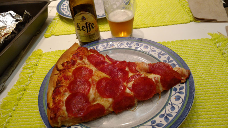 - Depois fomos buscar uma pizza de janta no Fat Slice (US$9 duas fatias), de Uber também (US$5.40). Queríamos o sabor do dia que havíamos visto no Facebook (com bacon),